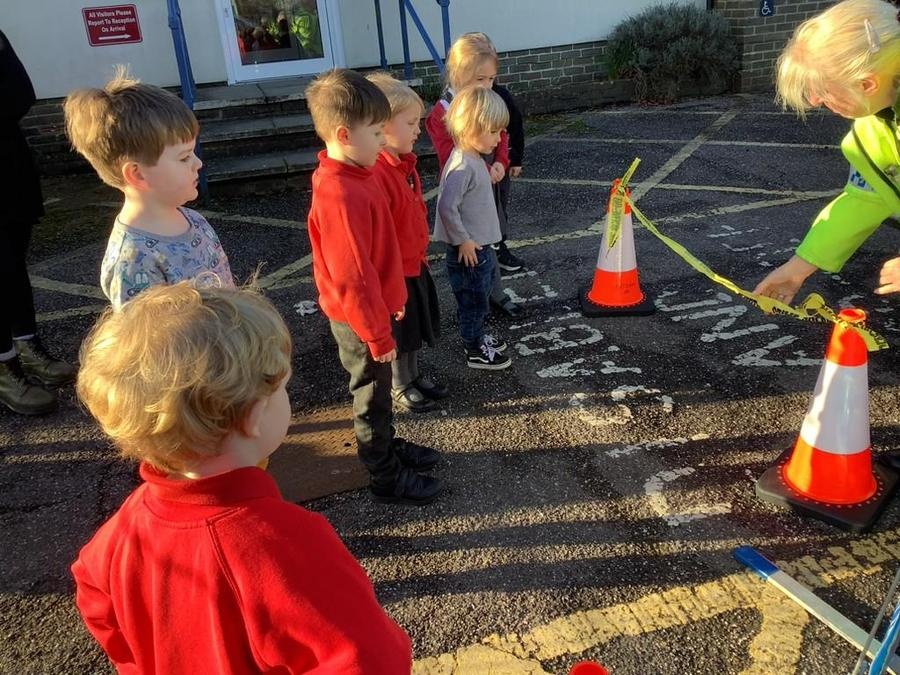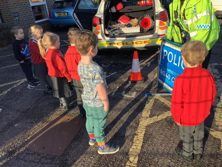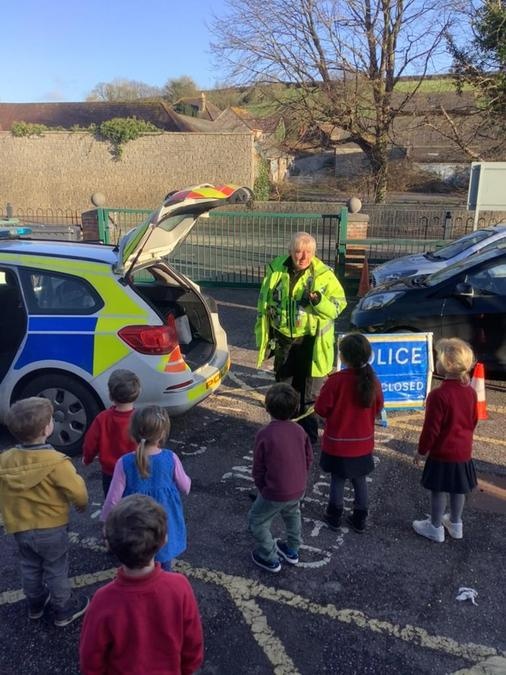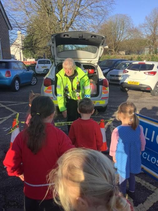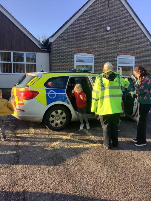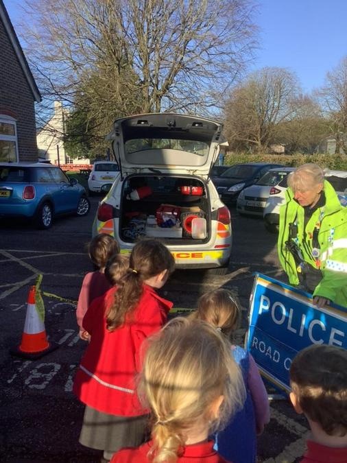 We went outside to see the police car, we heard the sirens and sat inside. We were told about the things that are kept in the boot such as a spade, broom, yellow tape, signs, lights, fire extinguisher and cones