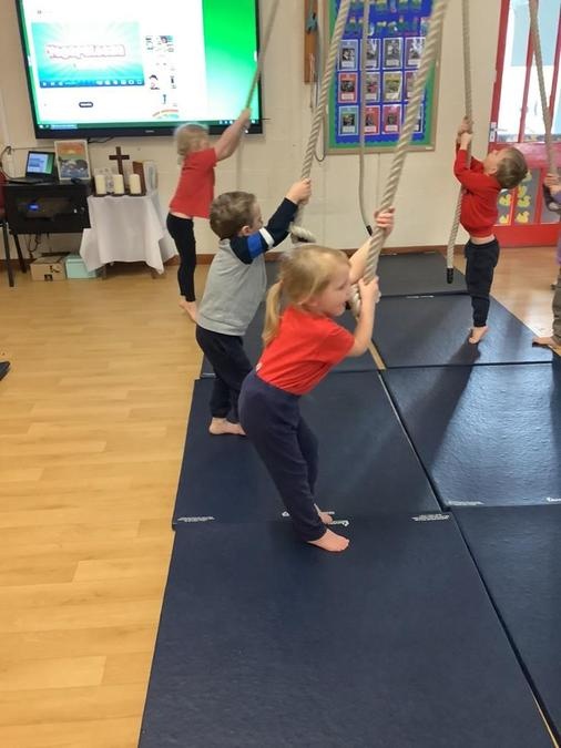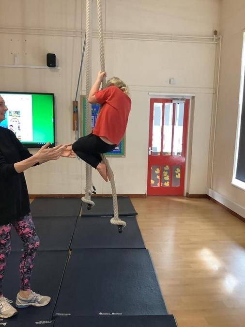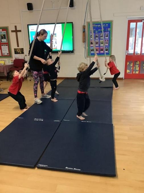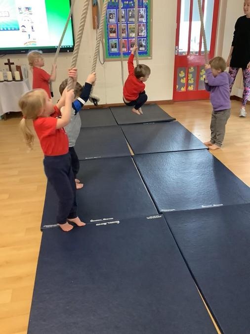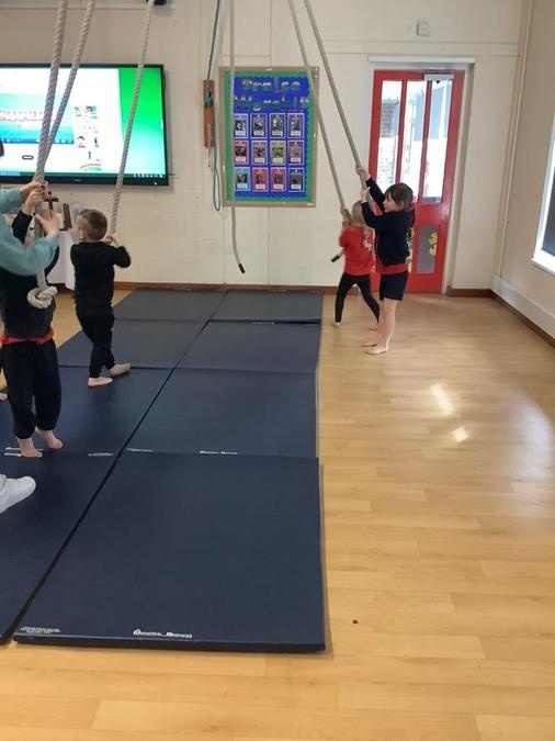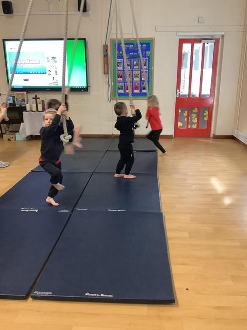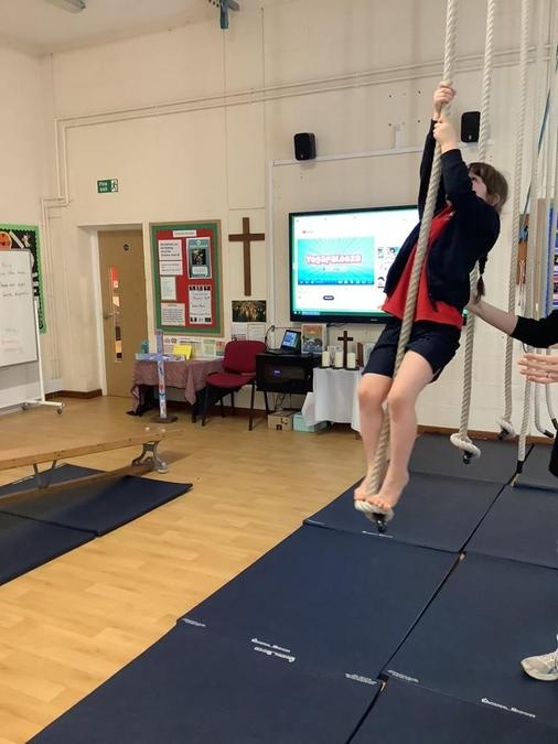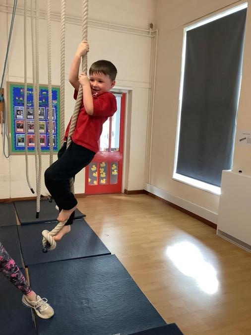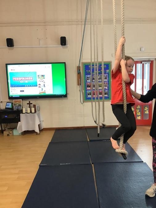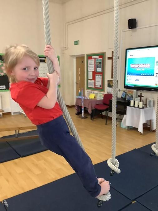 Every week in PE on a Wednesday, the children have been learning and developing their gymnastics skills with Mrs MacSwiney. They have been practising how to balance by walking up a balance bench, high jumps from an agility table to a safety mat , arm placement to show their finishing position and building strength in their arms, core and upper body to use the ropes.