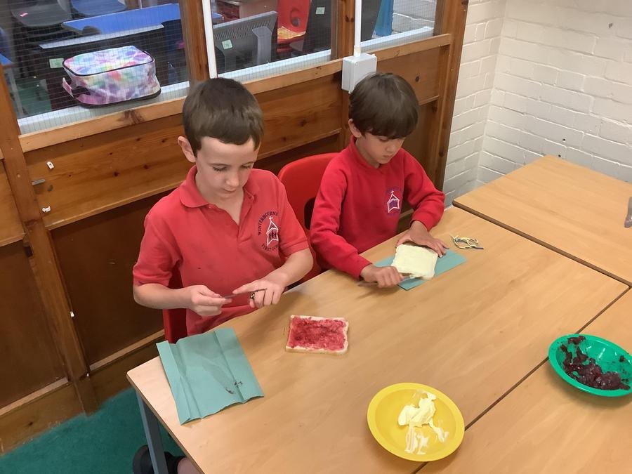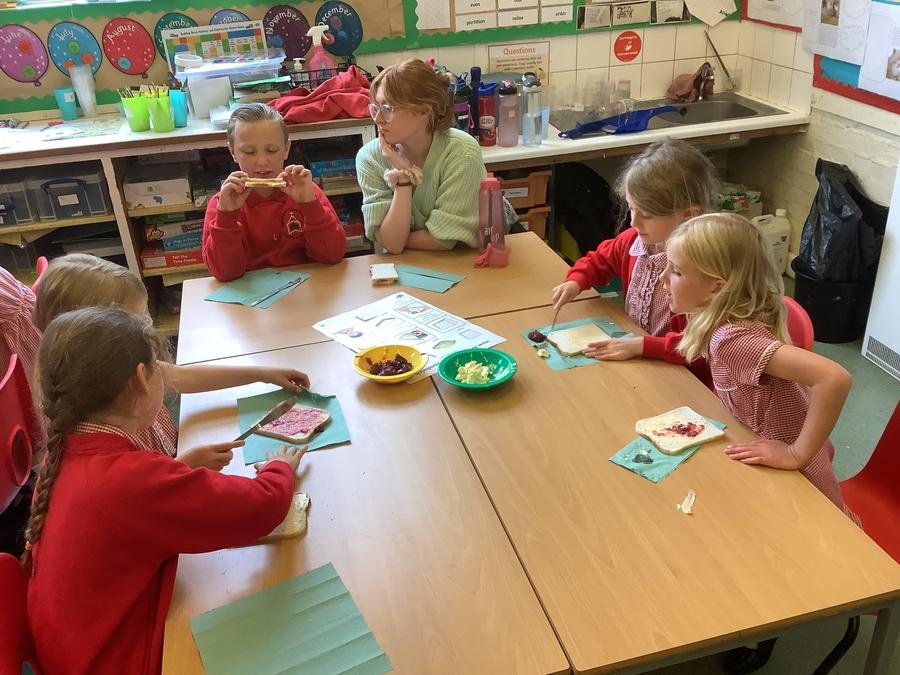 This week, we have been looking at instructions in Literacy. The children have been working in pairs to follow instructions to make a springy spider, worked individually to read/listen to some instructions and carry them out, they watched Mrs Beale 'incorrectly' make a jam sandwich four times! The instructions were not chronological and so the children sorted them so that they were chronological and then followed them to make their own jam sandwiches. They loved eating them! (see above)
