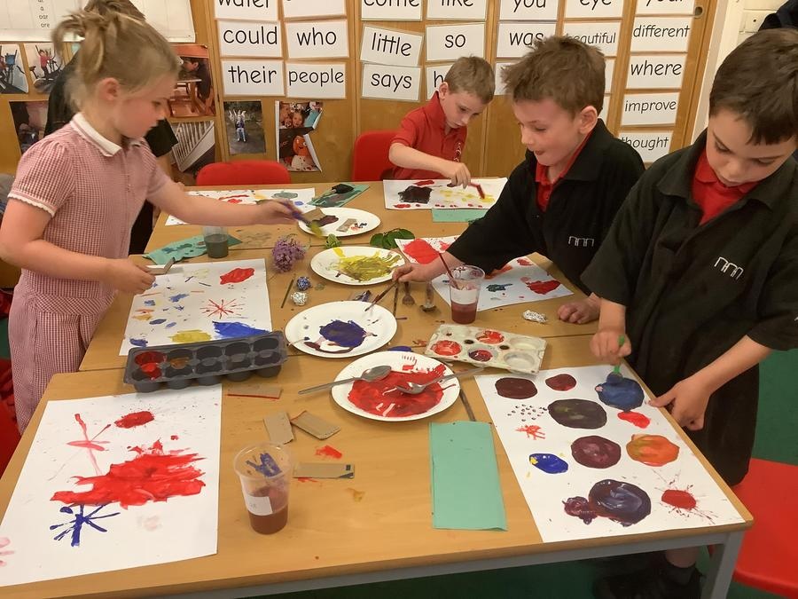 In Art, the children have been mixing primary colours to make the three secondary colours and then mixing the secondary colours together to see what happened. They noticed that when green, orange and purple were mixed together the page was darker than when the primary colours were mixed to make green, orange and purple. They then used white and black to experiment the shades becoming lighter and darker. The children were then 'texture detectives' and collected natural materials from the grounds. They used cotton buds, forks, sponges, paintbrushes, fingers, squares of cardboard and screwed up tinfoil to create different textures (see above).
