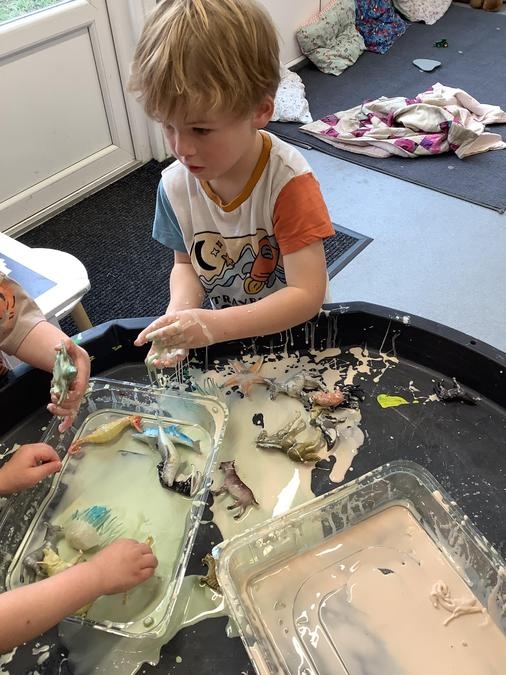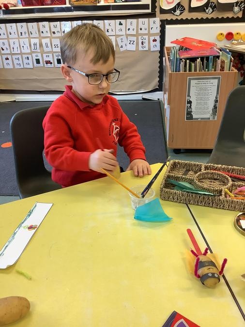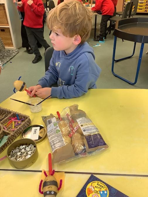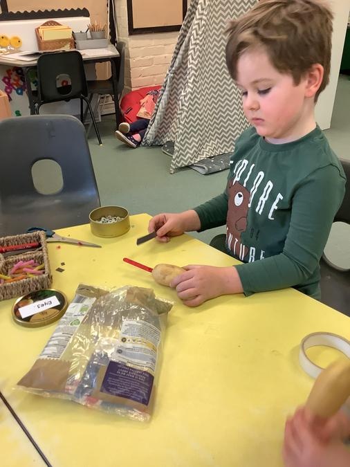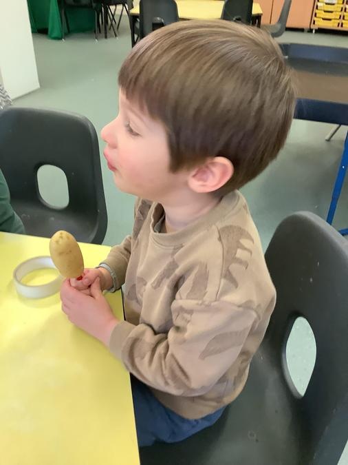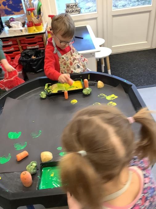 This week our topic book has been 'Supertato'. The children have been very busy practising their drawing skills by drawing and tracing their favourite characters. As well as drawing the children have enjoyed getting hands on with our messy tuff tray containing cornflour and water where they used their hands and spoons to move the cornflour and water over different animals. Blossom children have been using their imaginations fantastically with our small world tuff tray, extending stories based around the small world objects within the tray. By far our favourtie activity this week has been creating our very own Supertato which we carefully created then flew around the classroom!