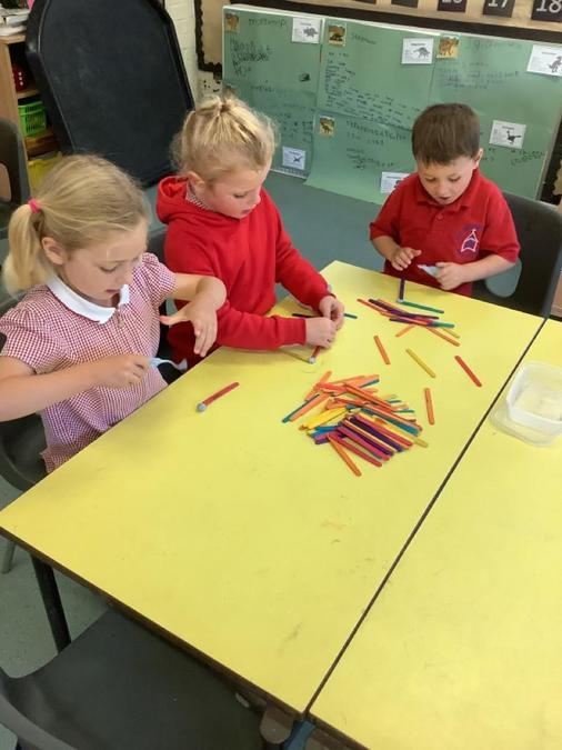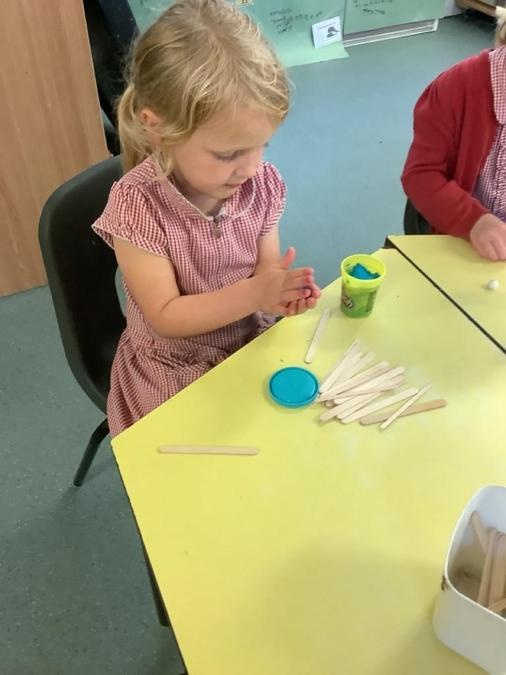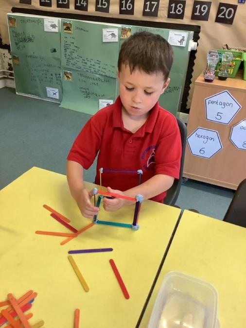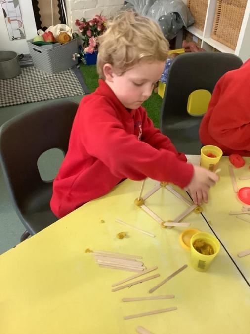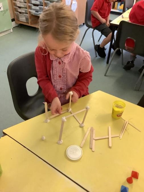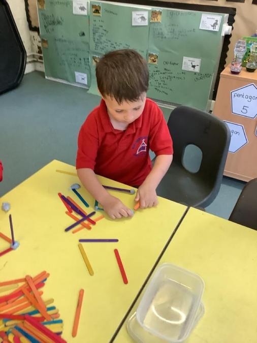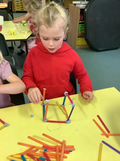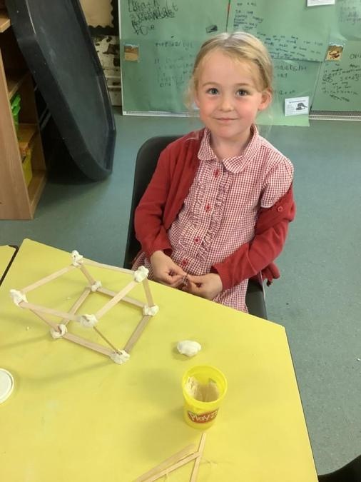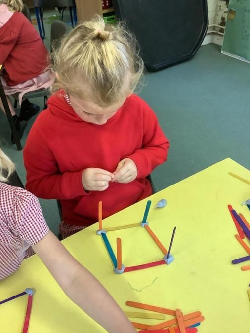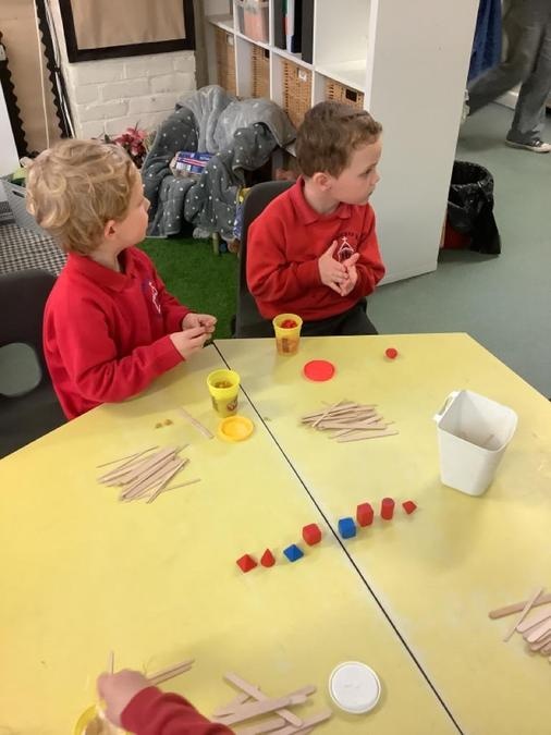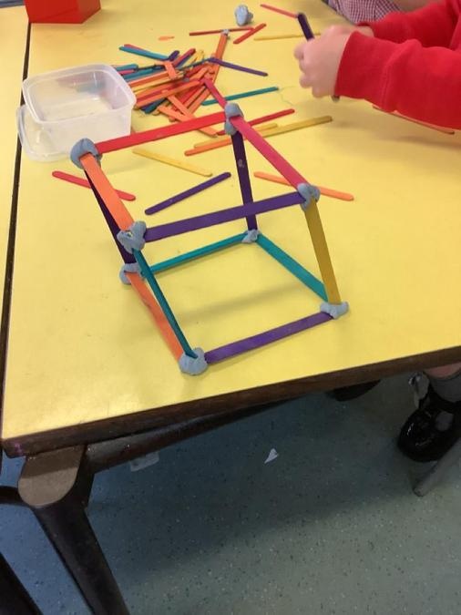 This week in our maths lessons we have been developing & securing our knowledge and understanding of the 2D & 3D shapes through different songs, activities & resources. The children's favourite activities were taking photographs of objects around the school & outside, then printing them to display in the classroom & making cubes using lollipop sticks and rolled spheres of playdough or blutac to join the sticks together. We also had a recap on our knowledge of AB, ABC, ABCD & ABCDD patterns, also using lots of different resources to enable the children to see patterns in different ways.