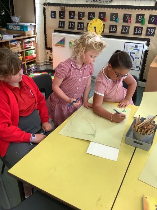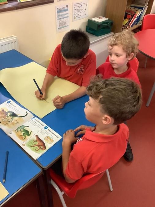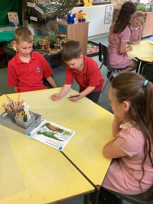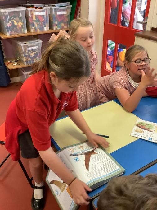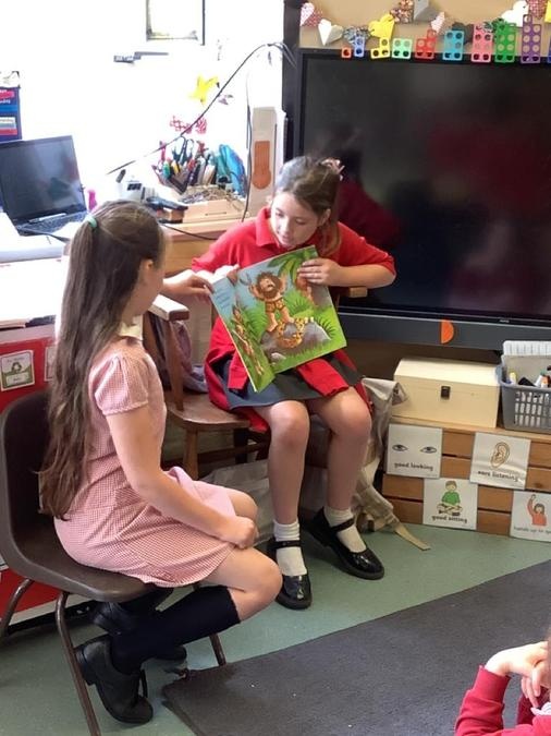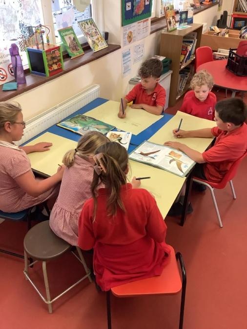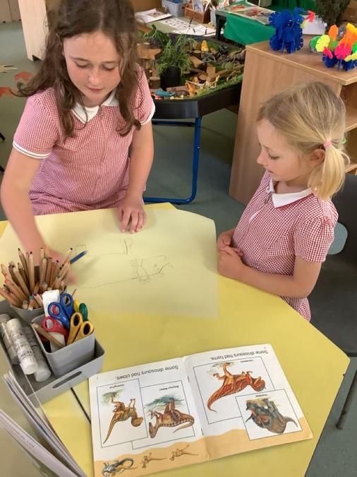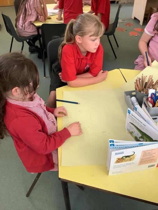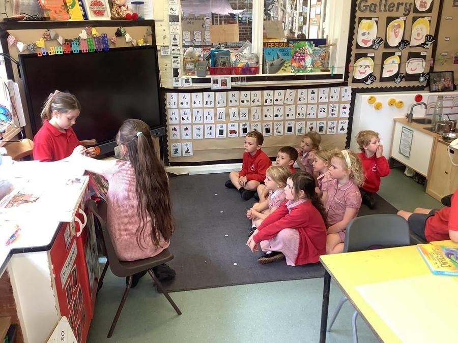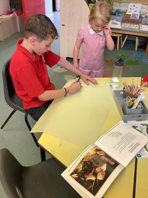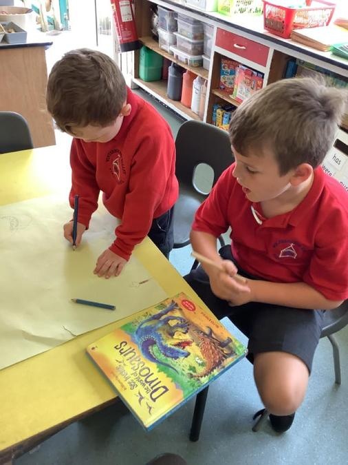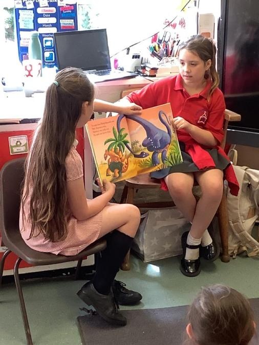Buddy Reading - The Year 4 class came to read the Cherry Class the story Dinosaurs Love Underpants. They then helped them to draw a large picture of their chosen dinosaur using non-fiction books for reference and some big underpants for them to decorate. The Year 4s will be coming back next week to help the Cherry Class to paint their dinosaurs & create patterns on the underpants ready to be displayed in the classroom.